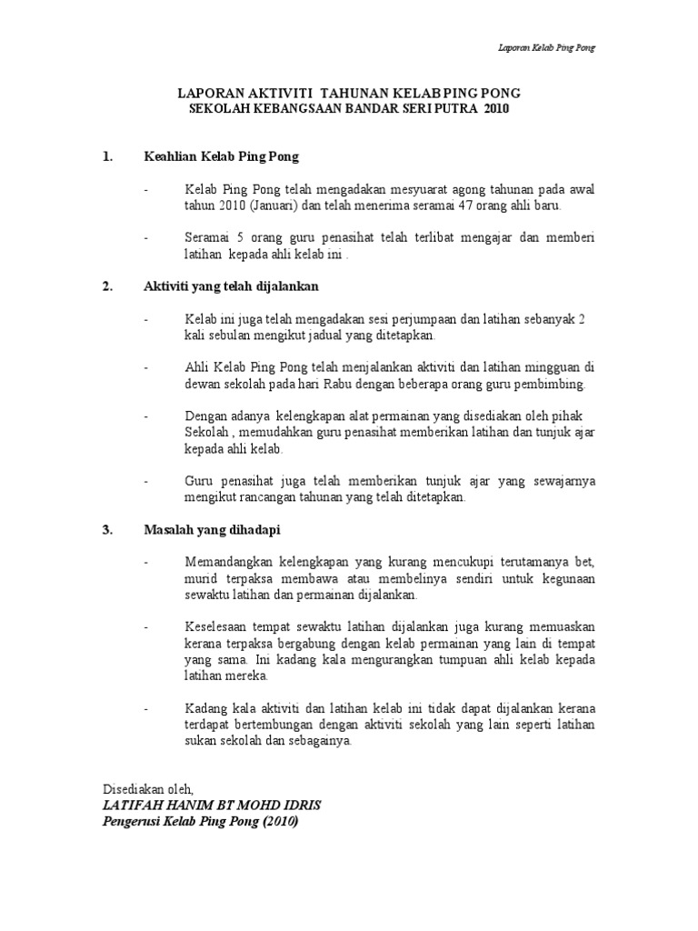 Laporan Aktiviti Tahunan Kelab Ping Pong Pdf